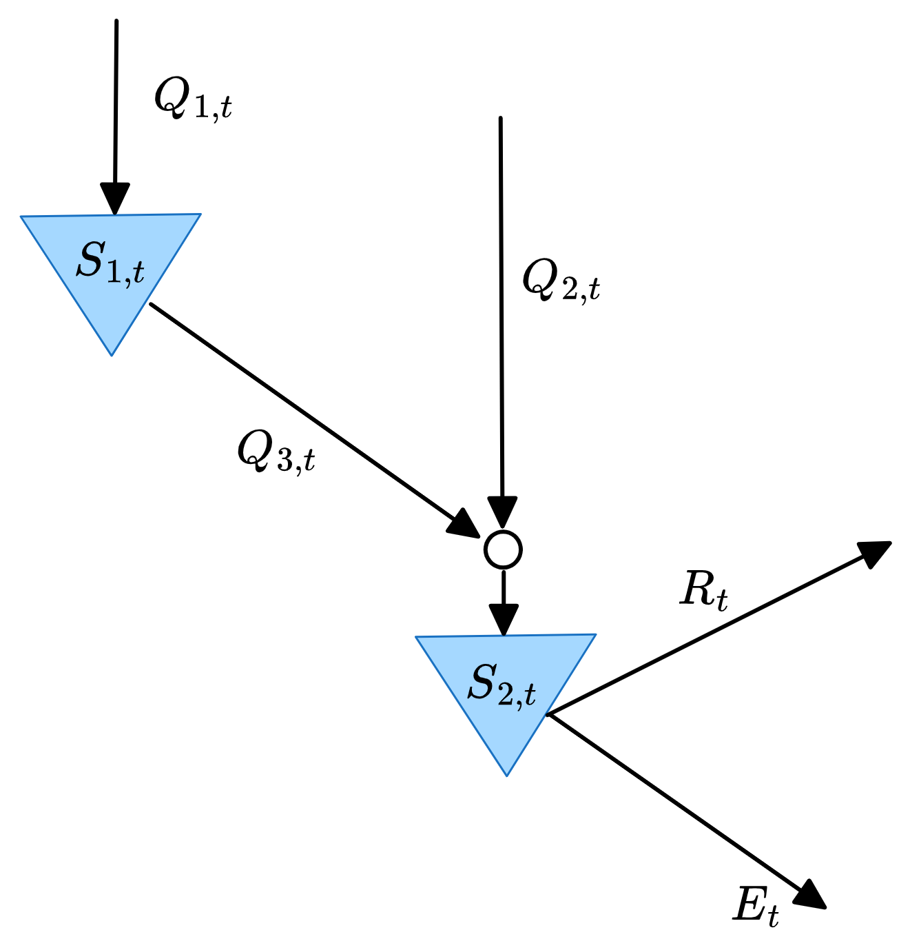 \[ \underbrace{\tau}_{\substack{\text{Residence} \\[0.5em] \text{Time}}} \times \overbrace{F}^{\substack{\text{Flow} \\[0.5em] \text{In/Out}}} = \underbrace{M}_{\text{Stock}} \]