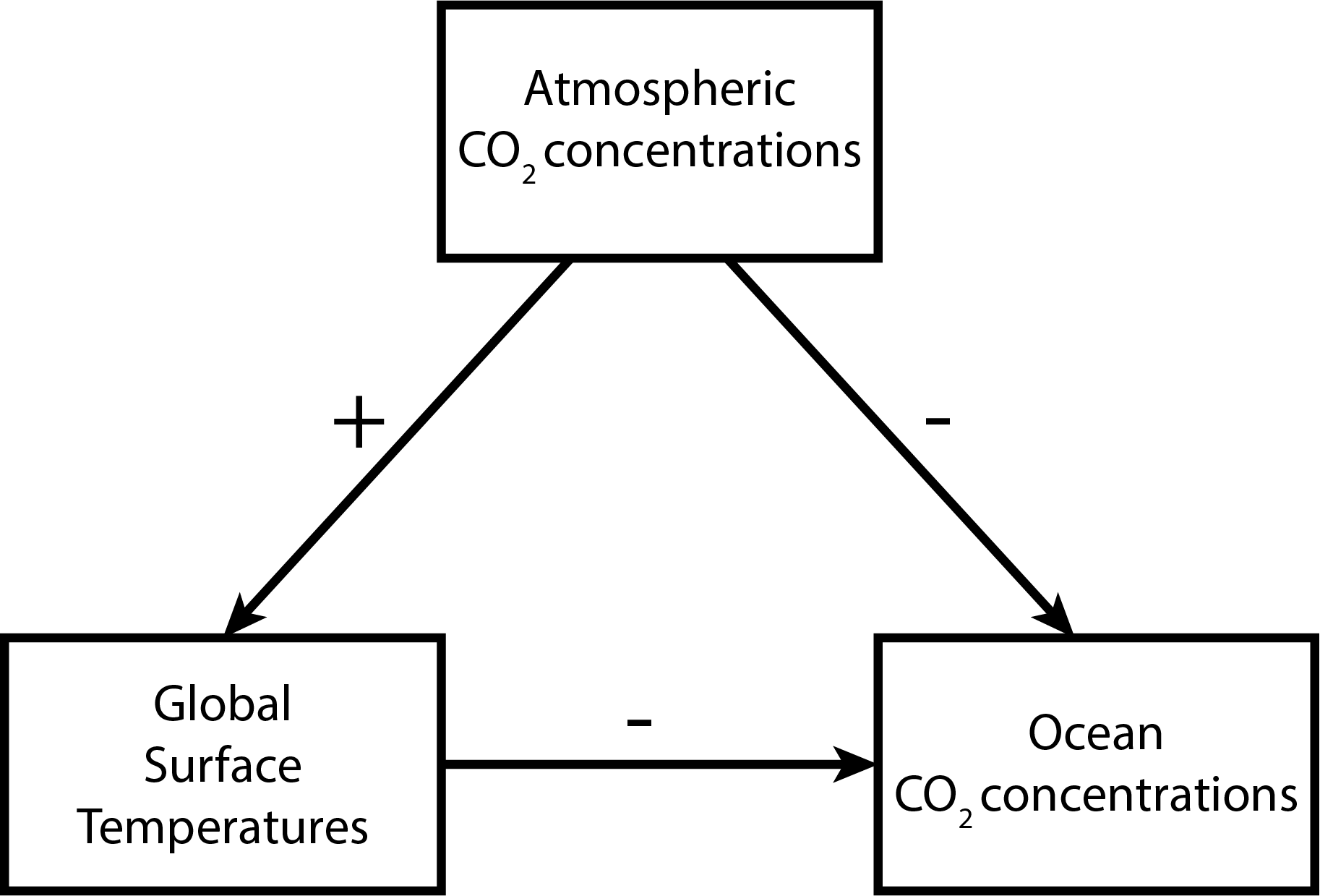 • The negative connection between global temperatures and ocean CO2 concentrations is a result of Henry’s law for the solubility of CO2. While the oceans are not an ideal mixture and the atmospheres and oceans aren’t in equilibrium (so one would be cautious in using Henry’s law to make specific predictions about concentrations), the key insight is the temperature dependence of Henry’s constant, where increasing temperature decreases solubility.
