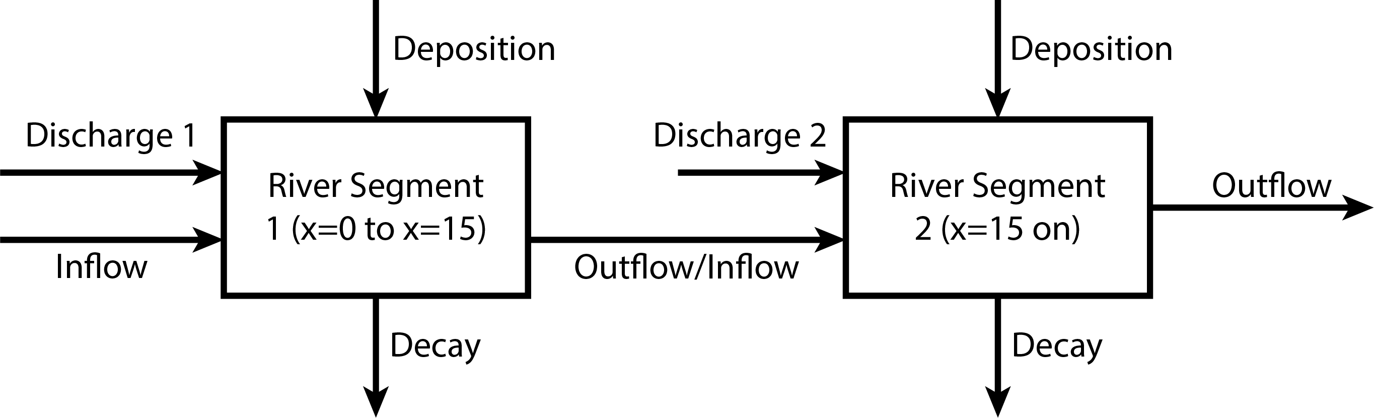 This is a two box (or two control volume) model, as there is a change in the mass-balance at the second wastewater discharge. As a result, the relevant diagram might look like this: